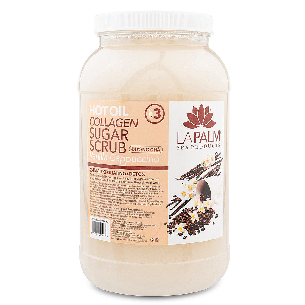 The La Palm Hot Oil Sugar Scrub in Vanilla Cappuccino offers rich exfoliation with a warm, coffeehouse-inspired scent. It gently removes dry skin while infusing deep moisture for smoother, softer feet and hands.